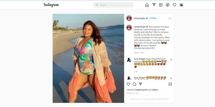 El canto de la familia Winter, miembro del reparto, ha alardeado de su espectacular transformación varias veces en los últimos meses. Uno de sus looks más atrevidos lo reveló a mediados de 2021, cuando publicó una foto de sí misma en traje de baño. “Me gusta comparar mi vida con la vida de una mariposa”, El canto de la familia escribió la estrella Winter, mientras compartía que ha pasado por muchos altibajos. Winter usó un traje de baño colorido con un patrón tropical y se veía impresionante. A los fanáticos les encantó su publicación en bikini y mencionaron que se veía drásticamente más delgada en la nueva foto.