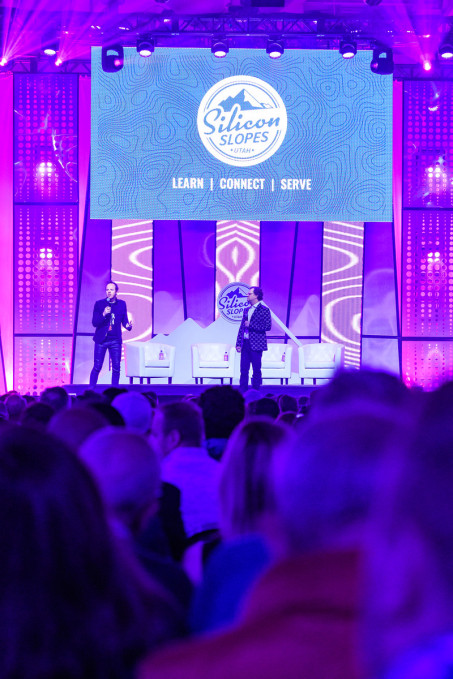 El cofundador de Qualtrics, Ryan Smith y Domo, y el fundador de Omniture, Josh James, en el escenario de la Silicon Slopes Tech Summit.