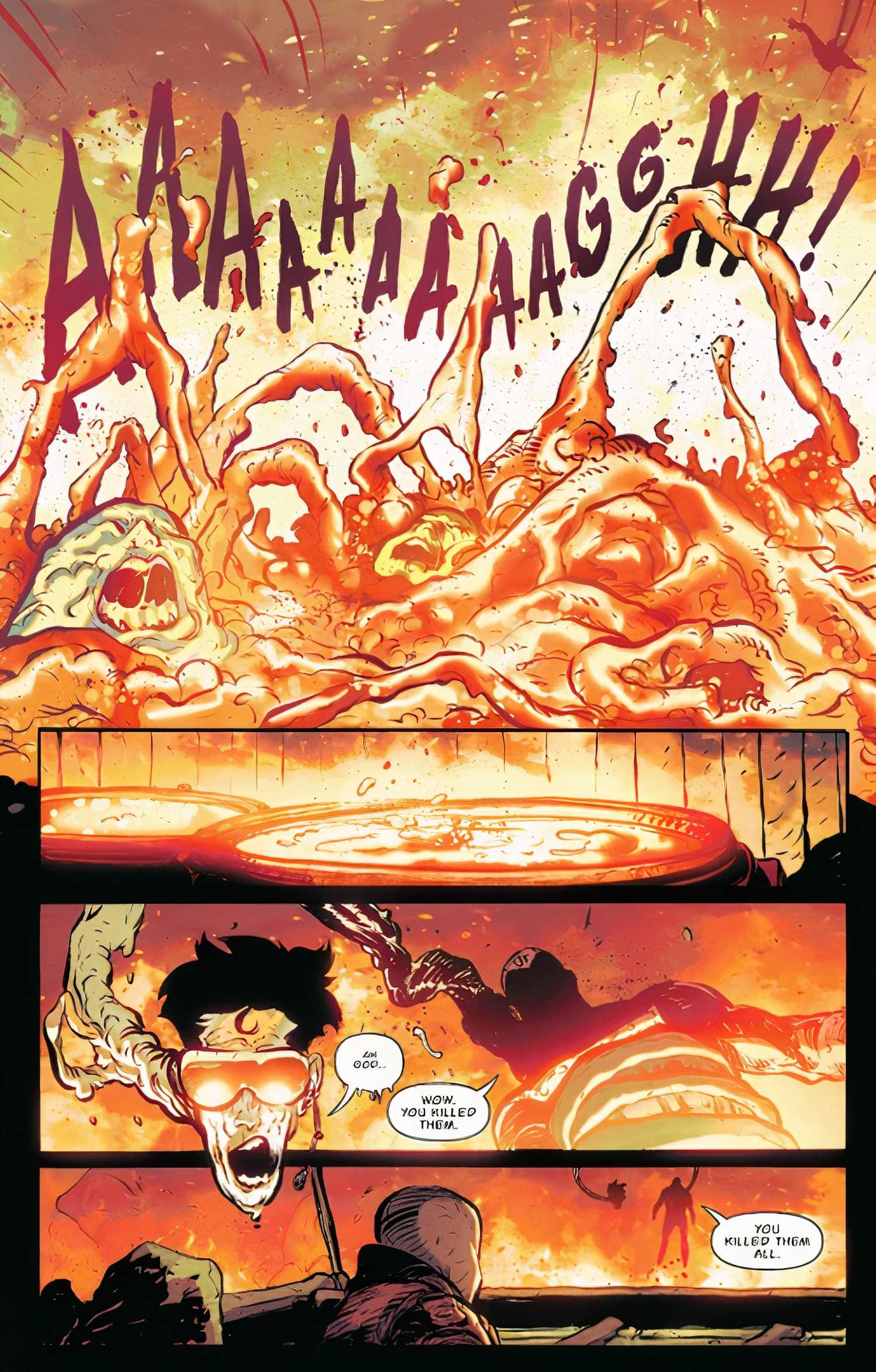 Mientras observa a sus hermanos derretirse, las escalofriantes palabras de Uranium, “Wow. Tú los mataste. Los mataste a todos”. marcan inequívocamente la transformación de Plastic Man en un asesino. Sus acciones, llevadas a cabo bajo la apariencia de un rescate, han provocado la muerte de seis héroes muy queridos. Estas muertes, sin embargo, no son sólo trágicas: sirven como un sombrío presagio de más víctimas por venir. El plan de Plastic Man es peligrosamente imprudente y la amenaza de una mayor destrucción acecha. Con la bomba nuclear aún en el horizonte, está claro que más vidas, ya sean héroes o civiles inocentes, podrían quedar atrapadas en las consecuencias.