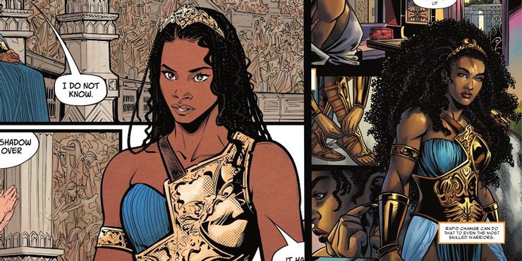 El papel de Nubia en DC Comics creció a lo largo de 2021, convirtiéndose en la nueva reina de Themyscira. Ese tipo de promoción requiere una actualización de vestuario, que hace su primera aparición en las páginas de Chica Maravilla # 1, pero desde entonces se ha trasladado a su propio cómic: Nubia y las Amazonas. El traje está construido con un vestido azul real con armadura asimétrica, hombreras de león en ocasiones y la riqueza de los acentos dorados que se esperan de una reina. La armadura históricamente informada es tan impresionante como icónica, y los fanáticos ya están ansiosos por ver más en el futuro.