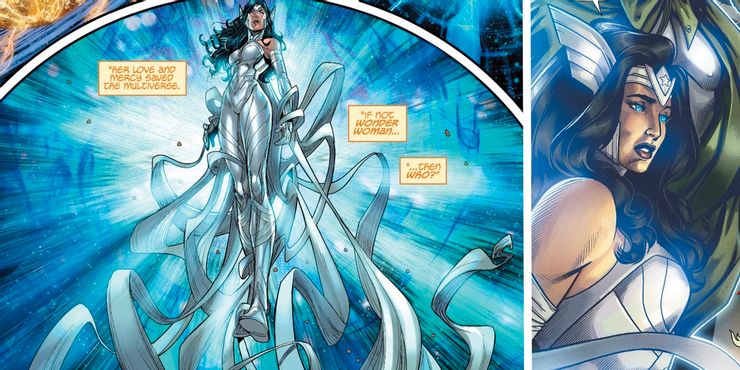 Frontera Infinita # 0 restablecer toda la continuidad de CC, marcando el comienzo de una nueva era tras el final de la Noches oscuras: Death Metal evento. Wonder Woman salvó el multiverso sacrificándose a sí misma, rechazando la oportunidad de convertirse en una de las quintaesencias inmortales, el grupo de seres más poderoso del universo de DC. Afortunadamente, esta negativa resultó en uno de los mejores atuendos de Wonder Woman hasta la fecha. Combinando elementos de su traje principal, pero cambiando el esquema de color a un etéreo blanco y plateado, la nueva apariencia de Diana la tiene preparada para el viaje a través del Valhalla por delante. Este atuendo es elegante y feroz, presenta los mejores aspectos de la heroína y un look angelical que ayudó a iniciar la nueva era de DC. Steve Trevor tiene un historial de llamarla “ángel”, pero DC realmente la convirtió en uno este año.
