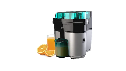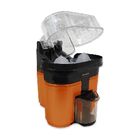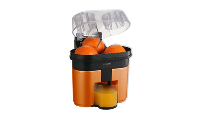 Disponible en dos acabados (naranja y gris metalizado), este exprimidor eléctrico saca provecho de sus 90 vatios de potencia, pero creemos que puede dar más de sí. Tanto la estructura como los accesorios disponibles son de plástico y su calidad da sensación de durabilidad. Al igual que sus contrincantes, dispone de dos conos exprimidores y un cortador en la tapa para que al cortar las naranjas no nos manchemos ni tengamos que utilizar un cuchillo. Es preferible usar naranjas de tamaño medio para que cada una de las mitades encaje lo mejor posible en el espacio reservado para ellas y no se muevan o desplacen demasiado.