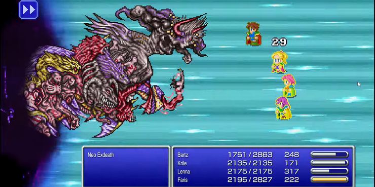 Como jefe, Neo Exdeath es creativo y engañoso, con una impresionante variedad de estrategias entre las que puede cambiar rápidamente. Se divide en cuatro partes, y cuando solo queda una, desata una andanada de ataques devastadores. El lado positivo es que hay algunos métodos baratos y fáciles de derrotarlo, y algunas clases pueden ser extremadamente formidables si se utilizan bien.