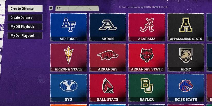 Desde aquí, encontrarás el “Libros de jugadas personalizados” Opción, que puede elegir para comenzar a crear sus propias estrategias. Cuando elijas “Crear ofensiva” Puedes elegir cualquiera de los equipos disponibles en el juego, utilizando su plan de juego base para construir. Si tienes un QB estelar en Fútbol universitario 26debes elegir un plan de juego ofensivo que tenga buenas estrategias para apoyar a ese jugador más.