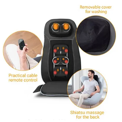 Masajeador eléctrico con calor incorporado (opcional) para tratar dolores y tensiones en la espalda y cervicales. Incluye tres velocidades, la función de cambio de dirección/rotación, temporizador de quince minutos y cuenta con cuatro potentes nodos de masaje que brindan una experiencia reconfortante.