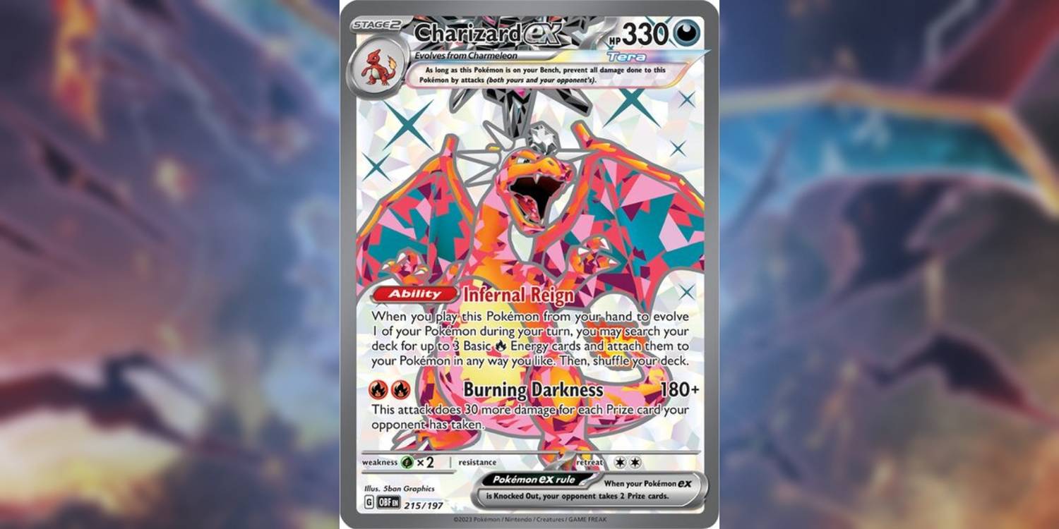 Charizard EX es el campeón reinante del JCC Pokémon en vivo formato estandar. Poco después de su lanzamiento de Pokémon TCGObsidian Flames, esta carta dominó la escena competitiva. Aunque sus ataques requieren Energía de Fuego, es parte de las formas Terastalizadas de Pokémon Escarlata y Violeta, convirtiéndolo en un Pokémon de tipo Oscuro. Úselo con un motor de robo de cartas como Bibarel o un tutor para tomar cualquier carta que necesite una vez por turno con Pidgeot EX.