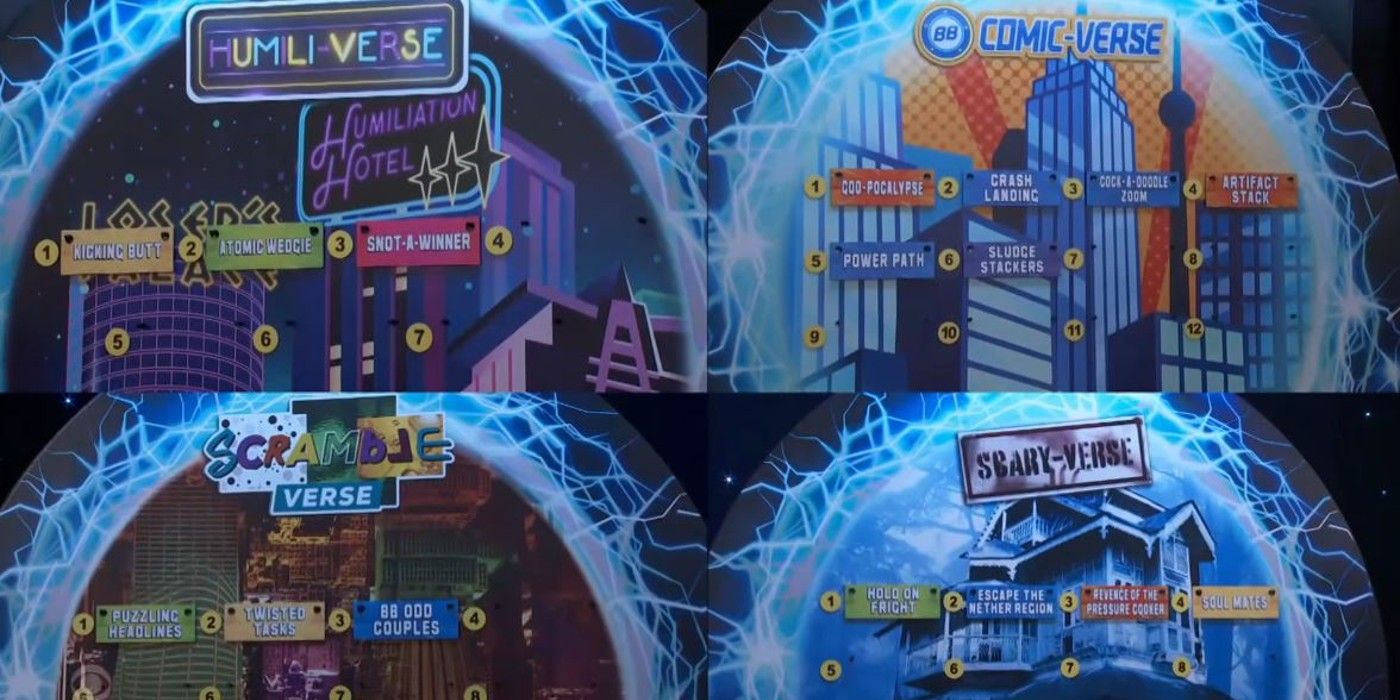 El Gran Hermano 25 El final comenzó con Bowie, Matt y Jag compitiendo en la Parte 1 de la competencia final de HOH, que les presentaron los cuatro multiversos. Comenzaron balanceándose en un disco sobre una burbuja de pensamiento de BB Comic-Verse, que los golpeó contra una pared de Scary-Verse. Luego los sumergieron en huevos revueltos falsos del Scramble-Verse y los cubrieron con pelo del Humili-Verse. También estaban empapados por una lluvia helada.