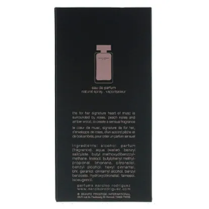 El perfume para mujer de Narciso Rodriguez cuenta con un tono rosado delicado y al mismo tiempo llamativo. El bote (100 mililitros) tiene una estructura rectangular y lleva incorporado un vaporizador para poder controlar la cantidad de colonia que se desea aplicar.
