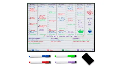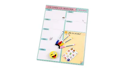 Se trata de un planificador completamente personalizable que se adhiere con precisión y eficacia a cualquier superficie magnética. Tiene unas dimensiones totales de 43 x 33 centímetros y el paquete de compra incluye cuatro rotuladores de diferentes colores y un borrador con imanes que se pueden colocar sobre la propia pizarra, ahorrando espacio y ganando en comodidad.