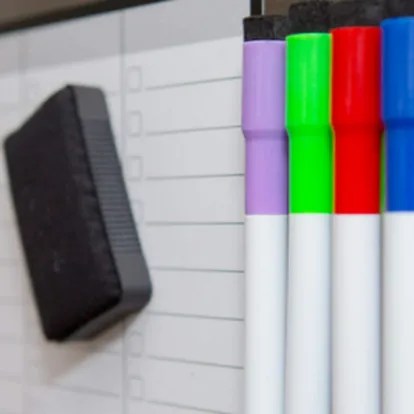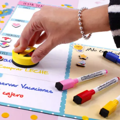 Una opción reutilizable acompañada por cuatro rotuladores no permanentes que pueden limpiarse sin esfuerzo con un paño húmedo o con el borrador.