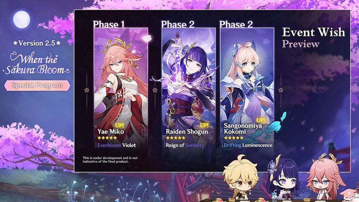 Impacto de Genshin El sistema de banners recientemente renovado significa que habrá tres banners de personajes separados a lo largo de la actualización 2.5. La primera mitad de la actualización tendrá un cartel en ejecución (protagonizado por Yae Miko), mientras que la segunda mitad tendrá dos carteles repetidos que se ejecutarán simultáneamente (Raiden Shogun y Sanganomiya Kokomi).