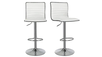 Un par de taburetes altos con un soporte cómodo, ya que se encuentran acolchados con espuma gruesa y tapizados con piel sintética de primera calidad, lo que también facilita su limpieza. La altura de los taburetes es ajustable y cuenta con un reposapiés, para ofrecer la máxima comodidad. Disponen de una estructura compuesta con acero cromado y una base resistente y antideslizante, capaz de soportar hasta 200 kilogramos de carga.