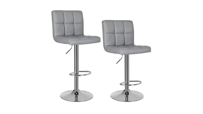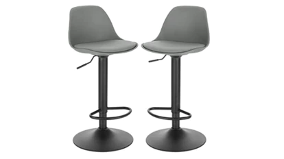 Pack de taburetes para decorar la cocina con un toque moderno. Su diseño es monocromático y se encuentran disponibles tanto en color gris como en negro. Su estructura se compone de un respaldo amplio, un asiento de cuero sintético y plástico fácil de limpiar y unas patas de metal duraderas, resistentes a la corrosión. También cuenta con un reposapiés circular, una palanca para ajustar la altura del taburete a cada persona y una base circular y estable. Incluye instrucciones y accesorios de instalación para un fácil y rápido montaje.