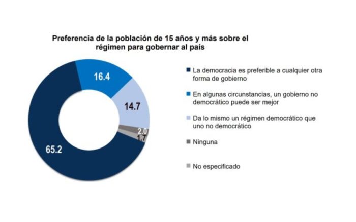 A nivel nacional, 73.4% de la población de 15 años y más sabe o ha escuchado lo que es la democracia. De esta población, 65.2% la considera preferible a cualquier otra forma de gobierno. De este mismo conjunto de población, 16.4% piensa que en algunas circunstancias un gobierno no democrático puede ser mejor y 14.7% opina que da lo mismo un régimen democrático que uno no democrático.