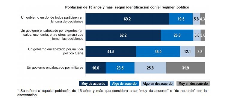 El 69.2% de la población -indica la Encuesta- considera que tiene los conocimientos y habilidades para participar en actividades políticas. En contraste, 77.5% de la población consideró que para gobernar un país es necesario un gobierno encabezado por un líder político fuerte, en tanto que la mayoría expresó su acuerdo con la participación de todos en la toma de decisiones y con la dirección de expertos. El 40.1 % dijo estar de acuerdo con un gobierno de militares, en tanto que 57.7 lo rechazó.