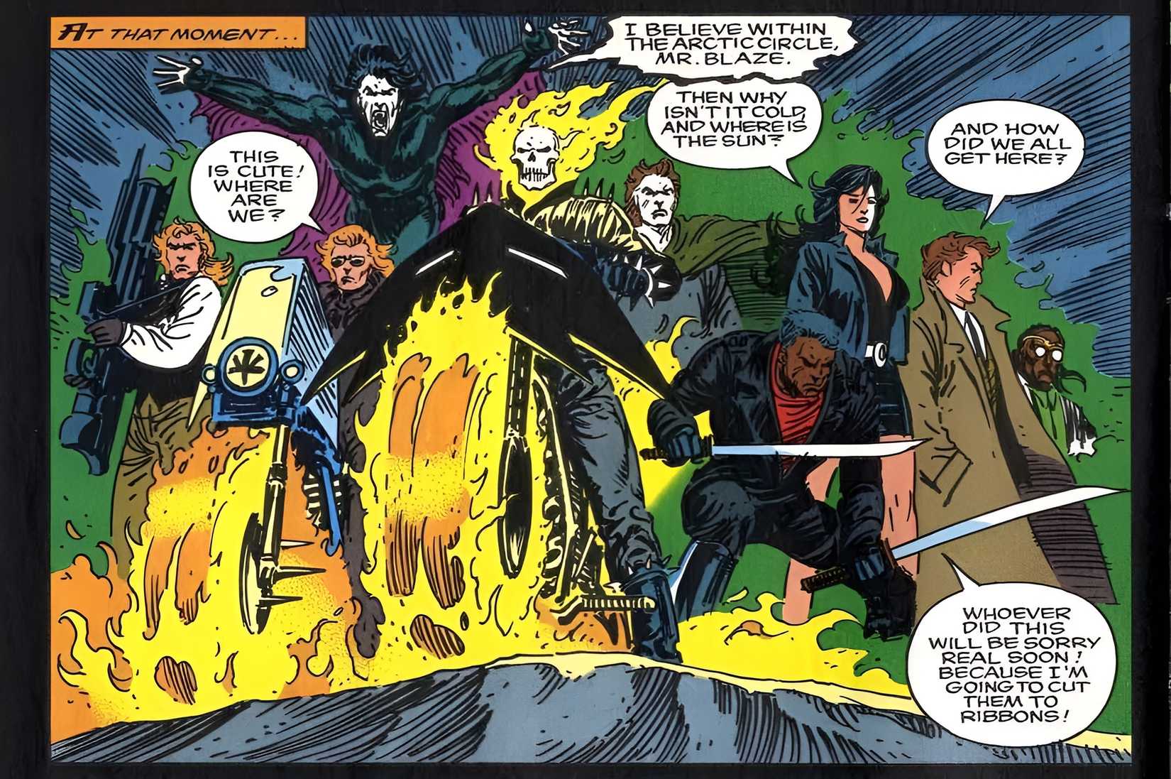 El motorista fantasma #28 (1992) – Escrito por Howard Mackie; Arte de Andy Kubert y Joe Kubert; Color de Greg Wright; Letras de Janice Chiang