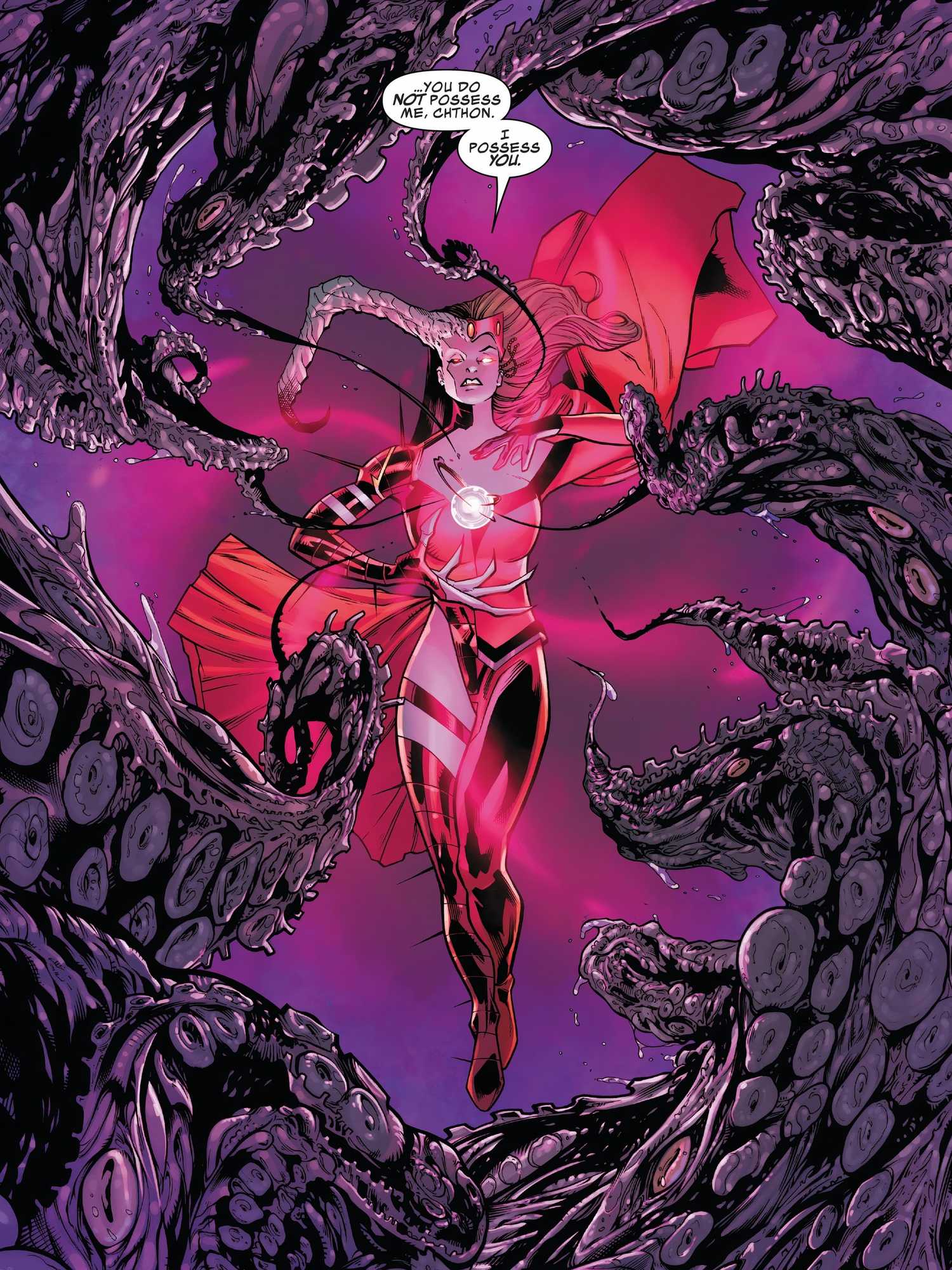 finalmente superó al Señor Demonio Chthon, absorbiendo su alma y el Darkhold en sí misma. Allí quedó bajo control el primer mal de la Tierra. Sin embargo, en una búsqueda egoísta por crear un nuevo Darkhold, Agatha Harkness se infiltró en el alma de Wanda y robó el corazón de Chthon. Sus esfuerzos inevitablemente resultaron contraproducentes, lo que llevó a la creación de una manifestación viviente del Darkhold.
