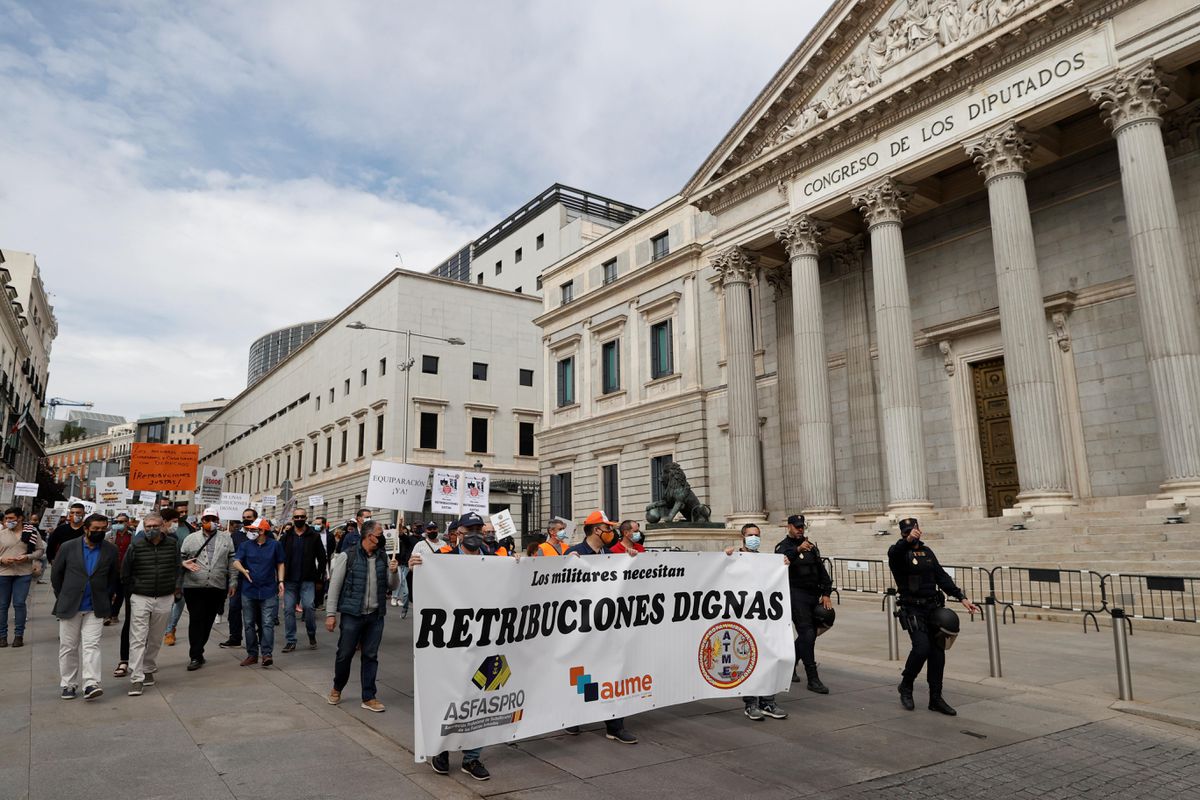 Cuatro días después de haber desfilado por el madrileño Paseo de la Castellana, cientos de militares se manifestaron este sábado, desarmados y sin uniforme, por la Carrera de San Jerónimo, desde la Puerta del Sol hasta el Congreso de los Diputados, para reclamar “retribuciones dignas”. Convocados por las principales asociaciones profesionales de militares (ATME, AUME y Asfaspro), los manifestantes se quejaron de que el Ejército “saque las castañas del fuego al Estado” cada vez que hay un problema, pero sus miembros sean los empleados públicos peor remunerados.