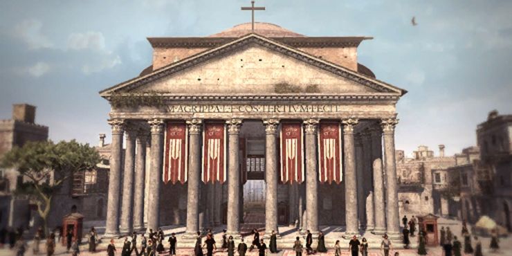 Hoy, la estructura es un sitio turístico muy conocido, y credo del asesinoEl Panteón es una espléndida recreación del impresionante edificio radial. Consiste en una fachada de columnas corintias que sostienen una cubierta a dos aguas y un frontón triangular, tras el cual se alza una increíble cúpula radial. El Panteón fue originalmente un templo a los dioses encargado por el estadista Marcus Vipsanius Agrippa en el 27 a. C. y fue reconstruido por el emperador Adriano en el año 128 d. C., y más tarde fue santificado como iglesia en el siglo VII. Sobreviven bocetos del Panteón en su antigüedad tardía, como el del arquitecto Giovanni Fontana, que representa la fachada con columnas y la cúpula esférica del edificio a fines del siglo XVI. La reconstrucción de Ubisoft parece ser relativamente precisa, con libertades solo para hacer que el edificio sea apto para la mecánica de escalada y para detallar el interior de la cúpula ricamente decorado.