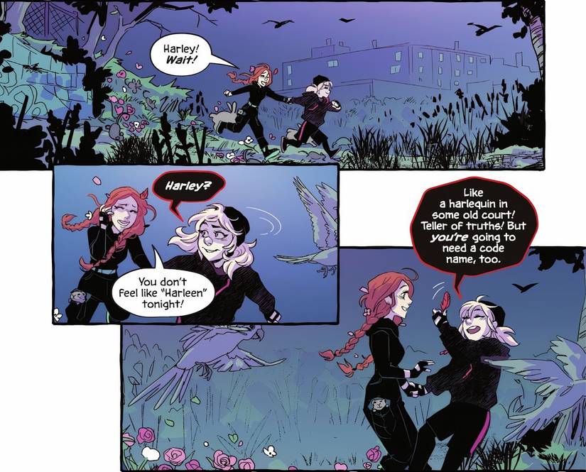 A pesar de que hasta ahora sólo se han revelado seis páginas, la novela gráfica ya ha introducido una alteración significativa en los orígenes del “harley” y “Hiedra” nombres en clave. En esta nueva interpretación, Las dos chicas eligen los nombres la una para la otra, divergiendo de los orígenes más oscuros vinculados a sus ex.