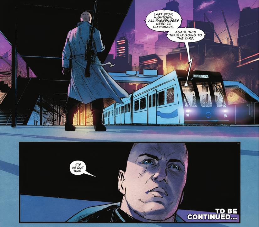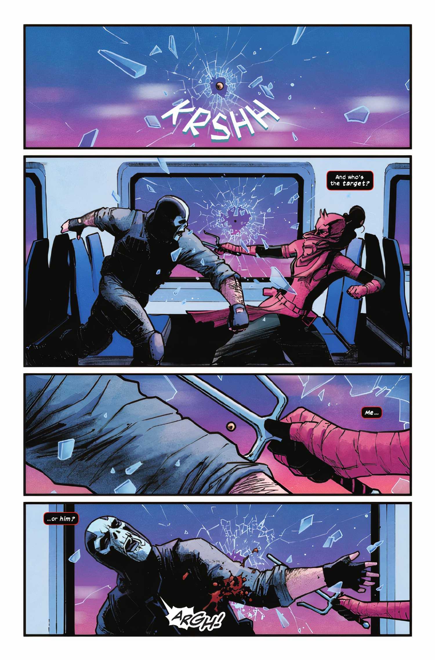 Cuando el tren llega a su última parada, una bala vuela justo entre Elektra y Crossbones. Daredevil mira hacia afuera para ver quién disparó y descubre que era Joe Garrison, el nuevo PunisherGarrison espera pacientemente que Elektra se vaya diciendo: “Ya era hora”.