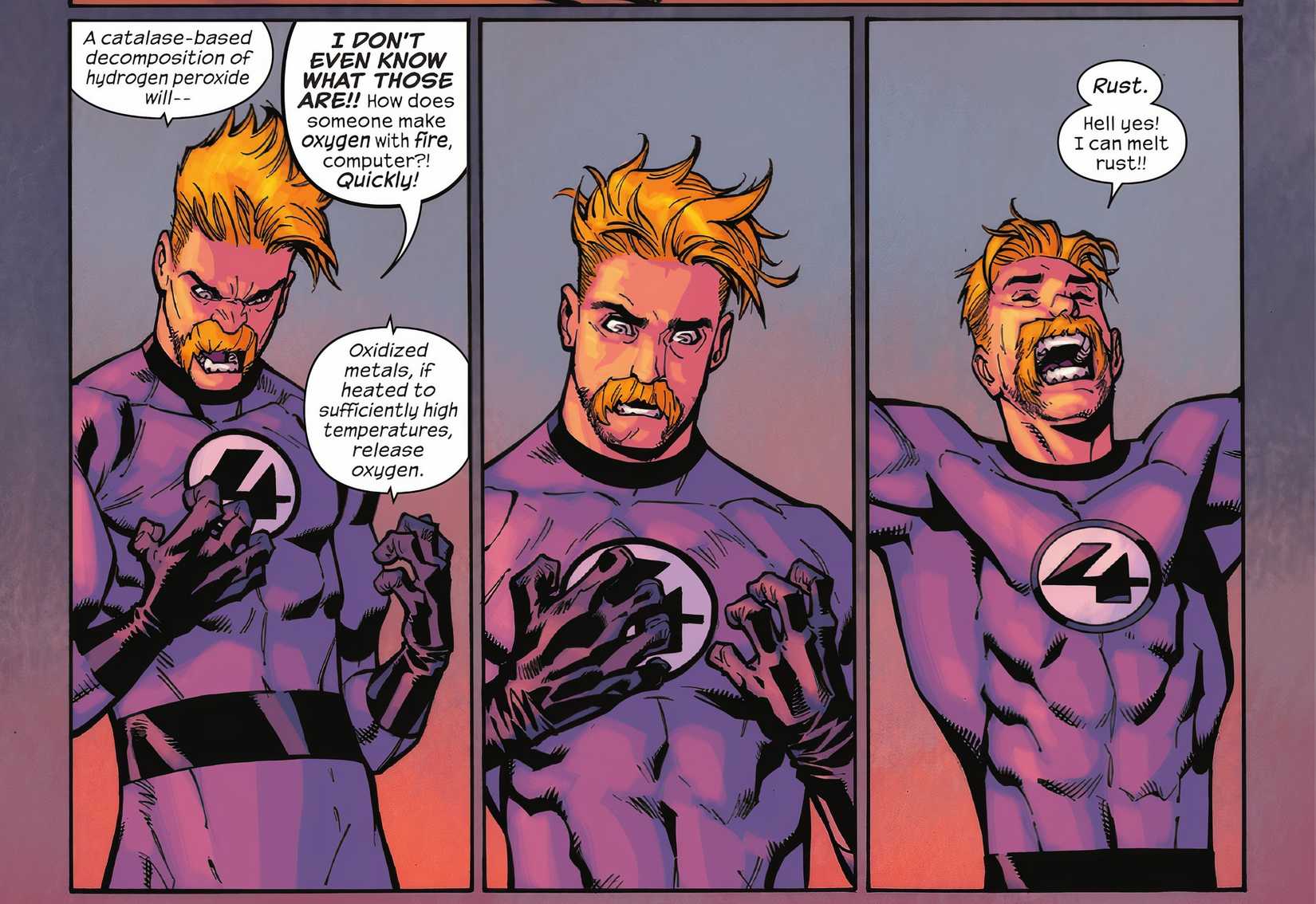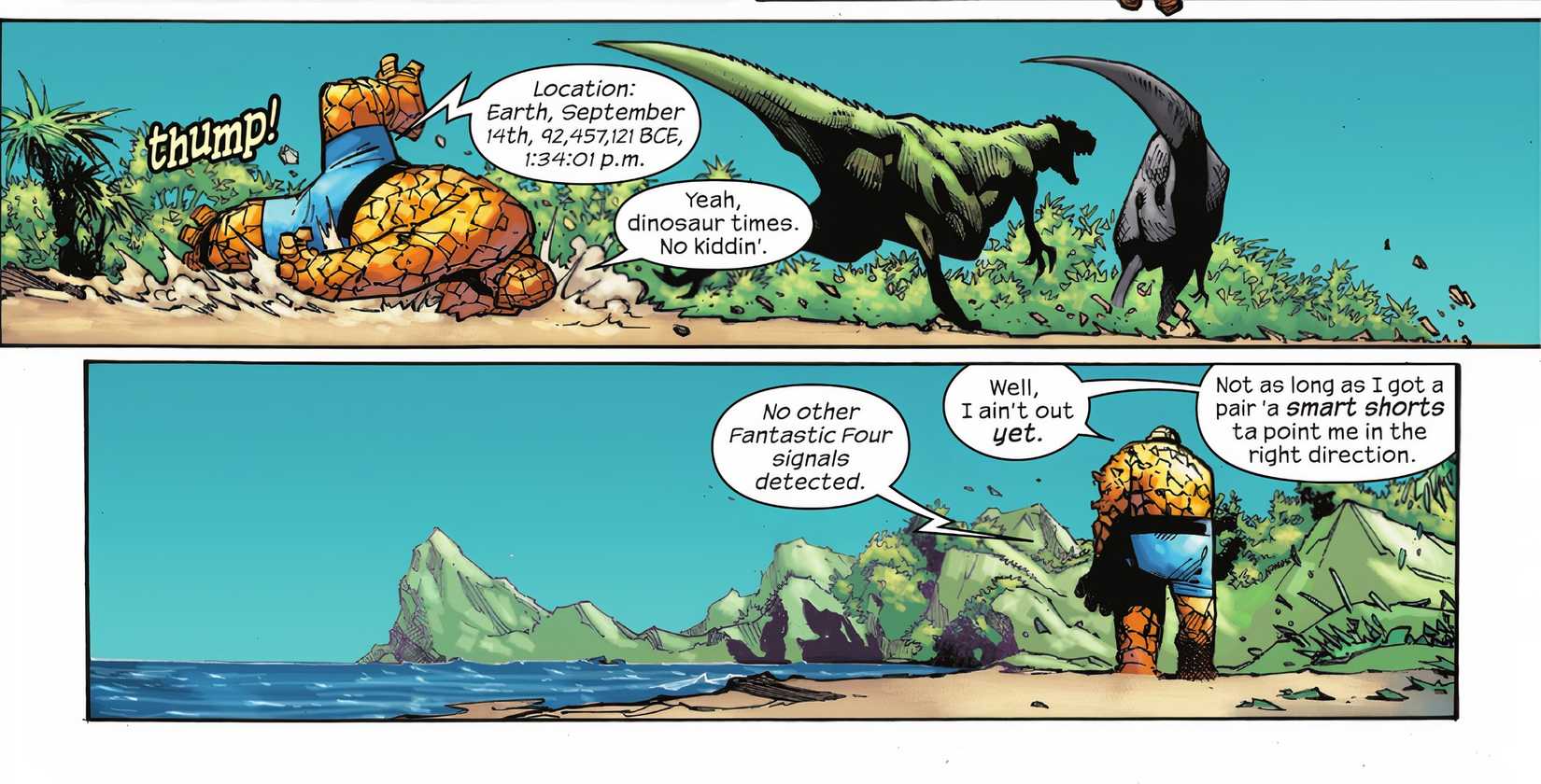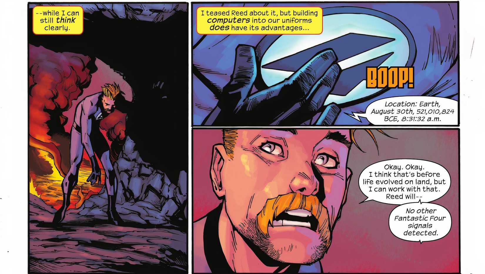 Afortunadamente, Mister Fantástico tuvo la previsión de agregar computadoras a cada uno de los disfraces del miembro del equipo. El La IA en sus trajes ayuda a los cuatro fantásticos a adaptarse a sus respectivos períodosofreciendo consejos para salvar vidas (como cómo crear oxígeno en la era del Cámbrico). Usando sus trajes, todo el equipo comienza a buscar una manera de contactar entre sí.