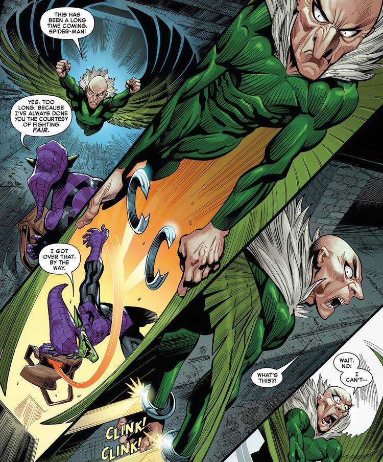 Al entrar en acción, el Buitre le dice a Spidey que su venganza ha tardado en llegar, solo para que Peter responda: “Sí, demasiado tiempo. Porque siempre te he hecho la cortesía de pelear justo.” Y está claro que, al reprimirse todos estos años, Spider-Man ha estado protegiendo a los villanos de Nueva York tanto como a sus inocentes..