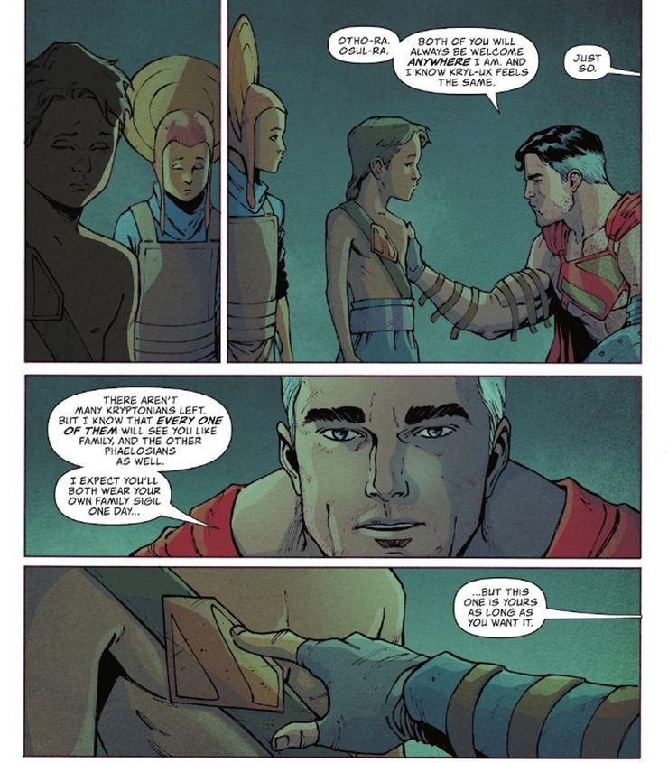 En Cómics de acción # 1045 por Phillip Kennedy Johnson, Will Conrad, Brent Peeples, Lee Loughridge y Dave Sharpe, acercándose al apogeo de la revolución de Warworld, Superman lleva a dos niños felosianos con él en una misión a través de Warworld para mantenerlos bajo su protección. El joven lo detiene y le pregunta “Cuando esto termine, ¿nos llevarás contigo? ¿A la tierra?” Ambos niños parecen dudar en regresar a New Phaelosia con su gente. Superman insiste en que algún día se sentirán cómodos usando sus propios sigilos familiares, pero dice que siempre es bienvenido a usar su escudo y “Ambos siempre serán bienvenidos donde sea que esté.“
