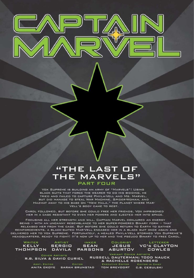 En su serie actual en curso, la Capitana Marvel se enfrenta nuevamente a Vox Supreme, que controla a los héroes con sus trajes negros, con un enfoque especial en las Marvel. Casi encarcela a Carol Danvers de forma permanente, pero Carol usó sus poderes de una nueva manera para crear un ser energético de sí misma usando su fuerza y voluntad que la liberó de una de las trampas de Vox. Los nuevos poderes del Capitán Marvel son similares a su forma binaria anterior; sin embargo, está completamente separado de su cuerpo real, ya que puede controlarlo desde su forma física. Con Vox Supreme (y un Mar-Vell de traje negro) capturando nuevamente a la Capitana Marvel, Danvers acaba de desatar su nuevo poder junto a Phyla-Vell, mientras intentan acabar con el supervillano para siempre.