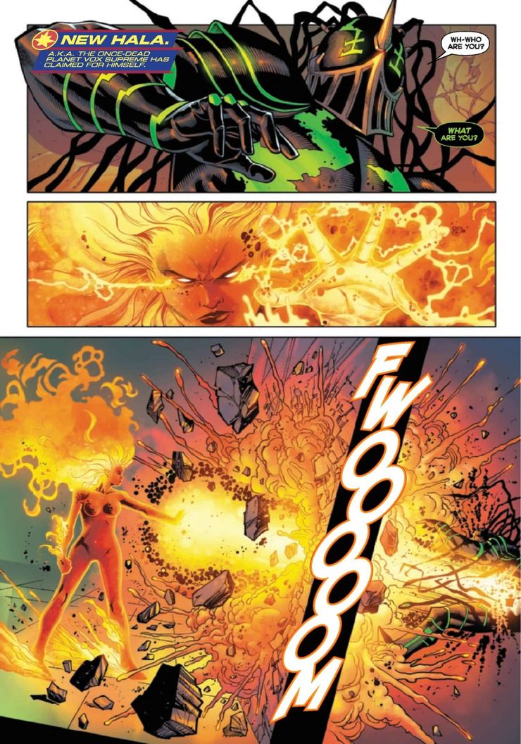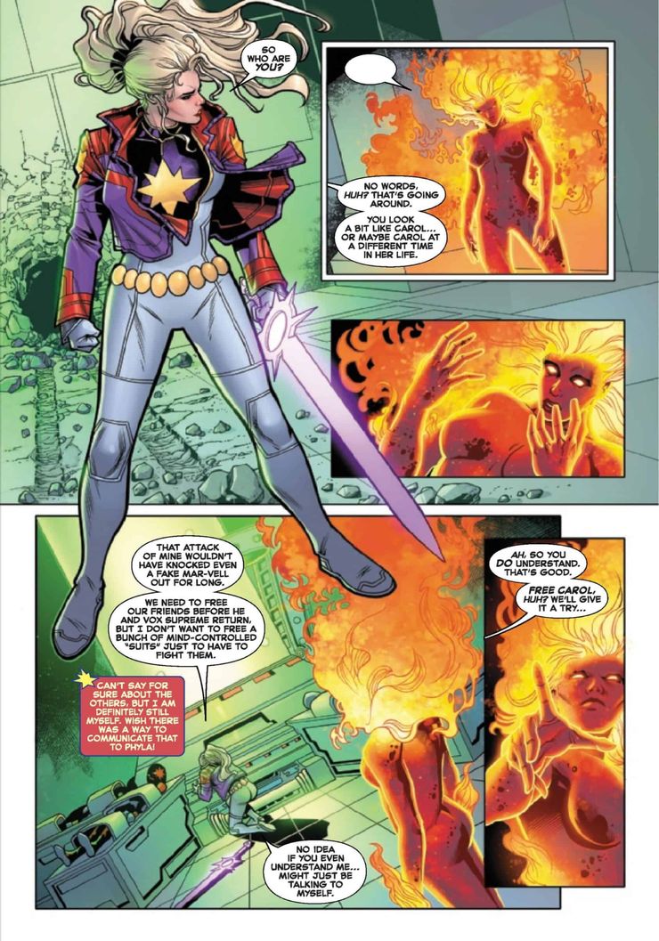 En una nueva vista previa de Capitán Marvel # 35 (H / T Comic Watch) de Kelly Thompson, Sergio Davila, Sean Parsons, Jesus Aburtov y Clayton Cowles de VC, Vox Supreme se sorprende al ver la nueva forma binaria de Carol Danver en acción. Phyla-Vell rueda con los golpes mientras usa la Espada Cuántica para derribar a un Mar-Vell atacante. Después de recomponerse, le pregunta a la forma ardiente quiénes son mientras observa que se parece a Carol “en un momento diferente de su vida”.