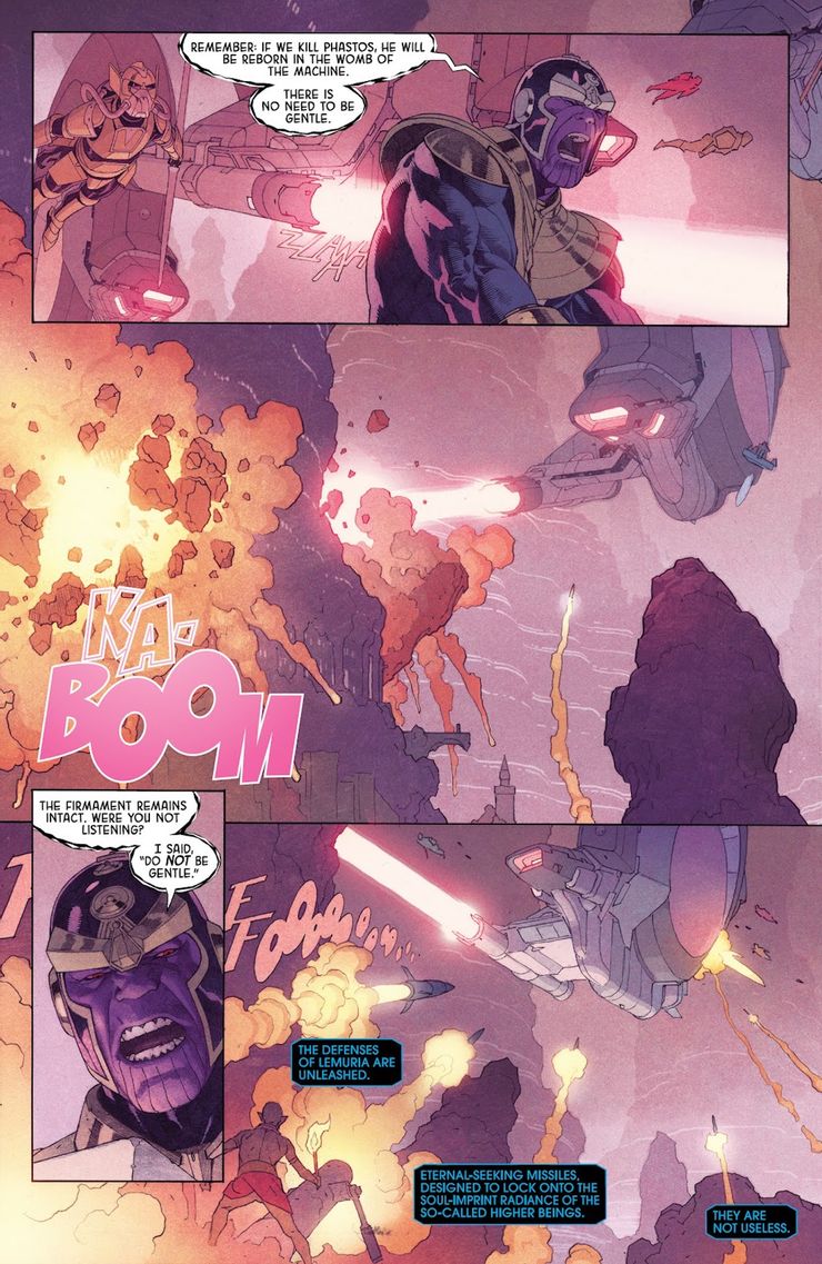 El caos y la destrucción son exactamente lo que sucede en Eternos #9, ya que el problema se abre con Thanos liderando un ataque a Lemuria, específicamente con el objetivo de encontrar a Phastos. Máquinas de guerra gigantes hacen llover fuego láser sobre la ciudad, mientras la Guardia lucha contra los Eternos con sus armas del fin del mundo. Con la Guardia manteniendo ocupados a los Eternos, Thanos encuentra y mata a Phastos con poca o ninguna resistencia. Con la misión completada, Thanos da la orden de purgar la ciudad, pero rápidamente cambia de opinión después de darse cuenta de que corre el riesgo de perder el Oceanic Watch al hacerlo. Tan rápido como habían llegado, Watch y Prime Eternal se teletransportaron.
