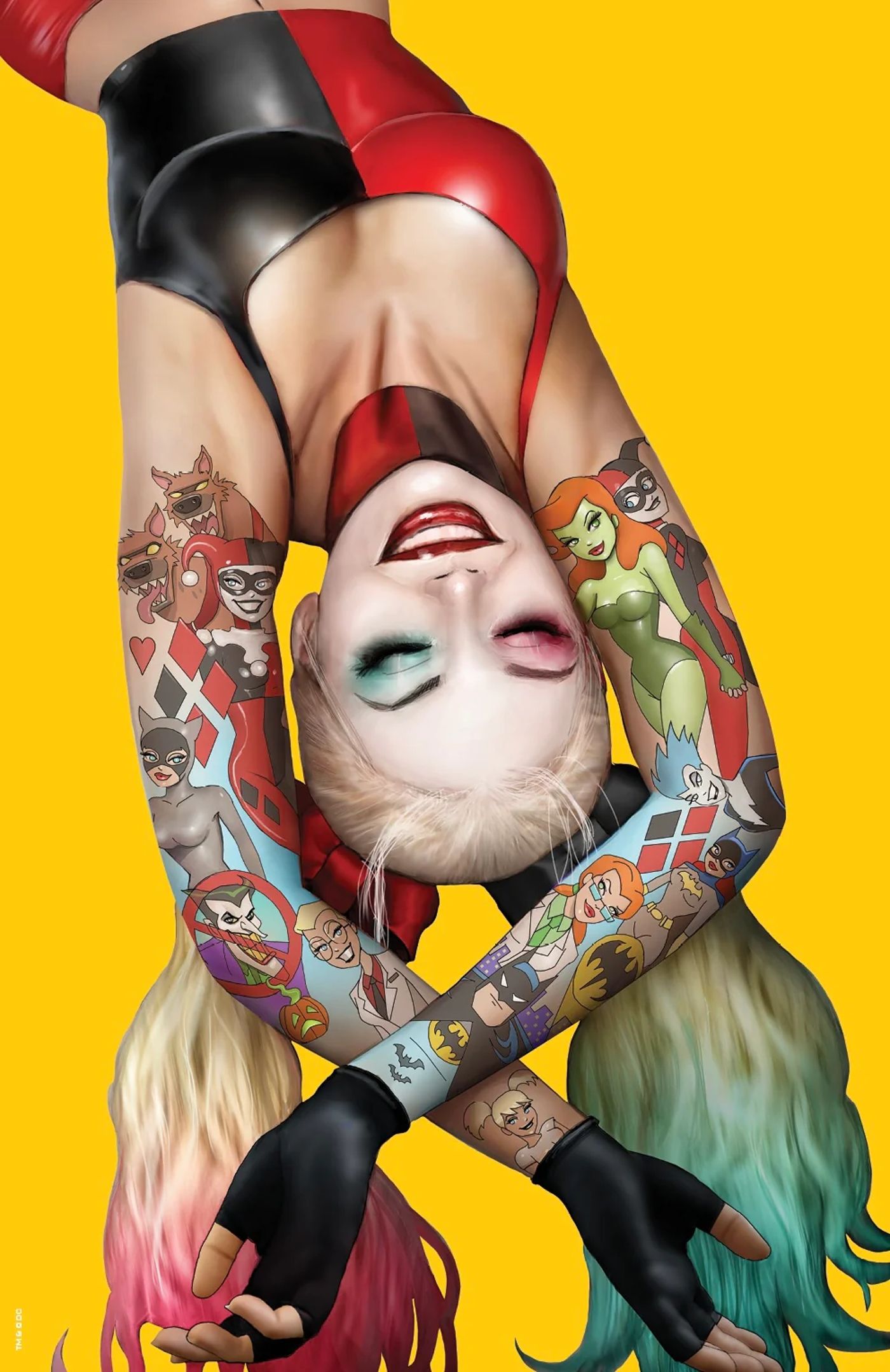 Una portada variante funciona como el tributo perfecto a harley quinn primeros días en Batman: la serie animada. Dos mangas de tatuajes resaltan el origen animado de Harley y muestran lo lejos que ha llegado desde el amado programa animado.