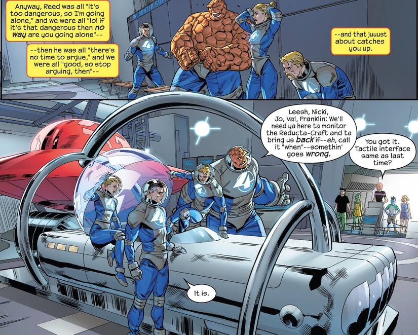 - Los nuevos uniformes en Fantastic Four #23 tienen un propósito: encogerse para investigar partículas misteriosas a nivel preiónico.