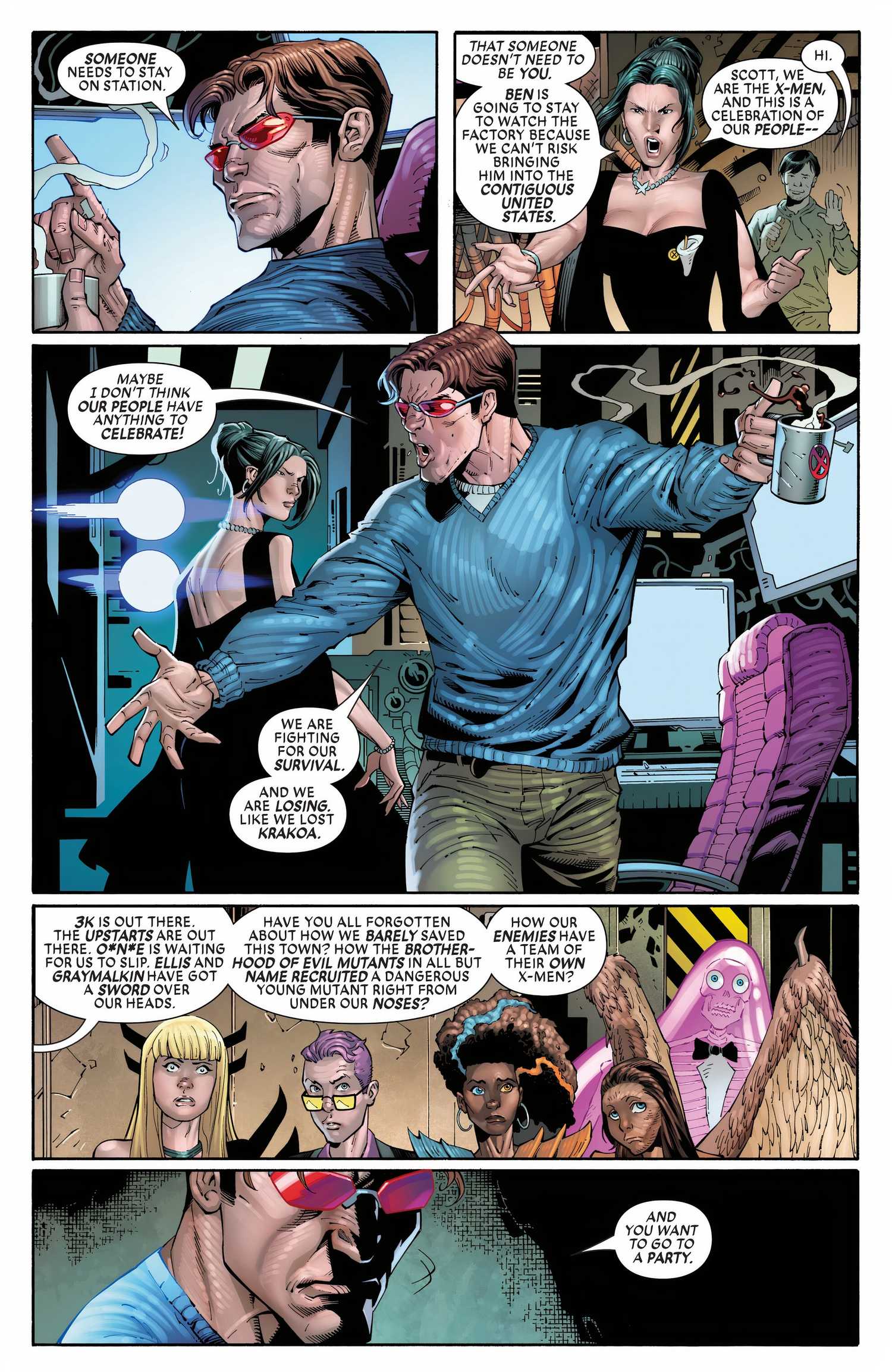 Terco pero firme en su determinación no Para ir a la vigilia, con todas las amenazas contra Mutantkind, manteniéndolo despierto por la noche: la organización 3K y las fuerzas O*N*E*, específicamente, Cyclops continúa actuando difícil mientras el equipo se teletransporta con su nuevo aspecto, con Scott con un suéter azul indescriptible mientras él se sienta y guisos.