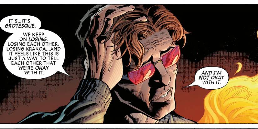 Después de que la esposa de Cyclops, el Jean Gray que viaja en el espacio, también conocido como Phoenix, aparece bañado en el fuego solo para burlarse de Scott por no ir a la vigilia, es aquí donde Cyclops admite que después de presenciar que Mutantkind pierde tanto últimamente, específicamente los Krakoa y cómo los mutantes se “perderán a los demás”. son bueno.