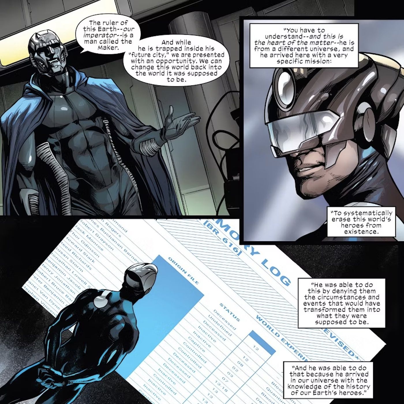 “/> El Creador ha utilizado el viaje en el tiempo para capturar, matar y/o quitar poder a cientos de héroes, convirtiendo la Tierra-6160 en su propio juguete; un mundo gobernado por un consejo secreto de líderes mundiales supervillanos bajo su liderazgo.