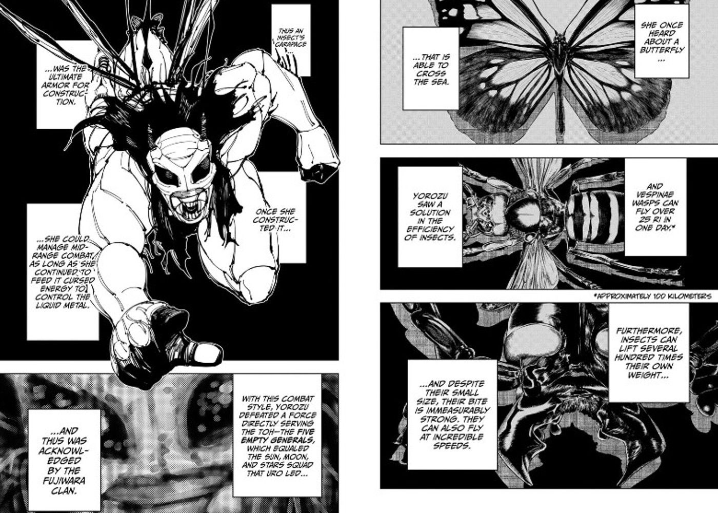 El capítulo 218, traducido por John Werry, se sumerge más en la historia de fondo de Yorozu, el antiguo hechicero que posee el cuerpo de la hermana de Megumi. Después de perfeccionar su técnica maldita basada en insectos, pudo derrotar a los cinco Generales vacíos, que eran un grupo de hechiceros alineados con los Toh. Estos hechiceros aparentemente tenían el mismo nivel de poder que Uro y el escuadrón de hechiceros que ella dirigía. Dado lo poderoso que parecía Uro en ella jujutsu kaisen pelear contra Yuta e Ishigori anteriormente en el Juego de sacrificio, estos Generales vacíos probablemente eran amenazas formidables que habrían sido perfectos para presentar como amenazas para ese arco.