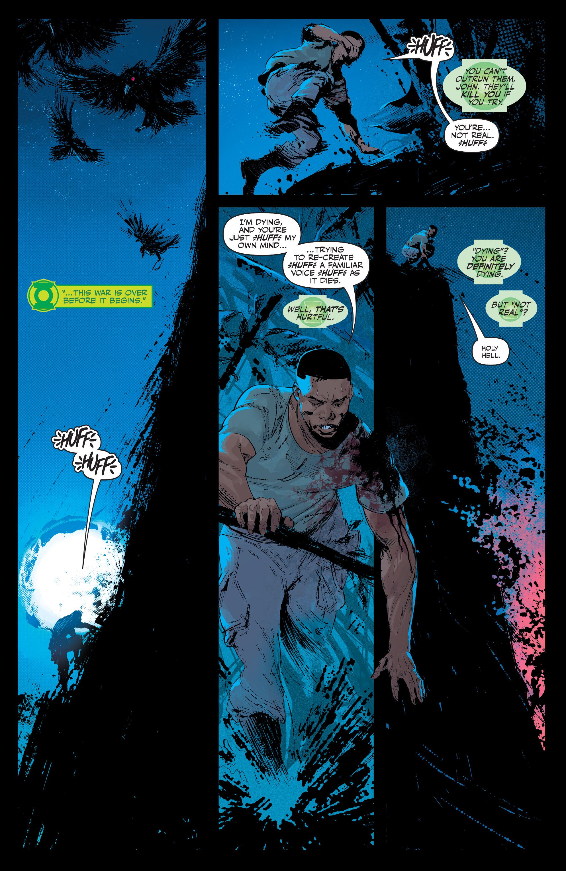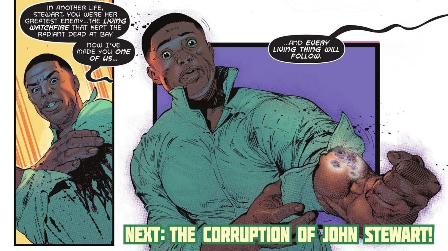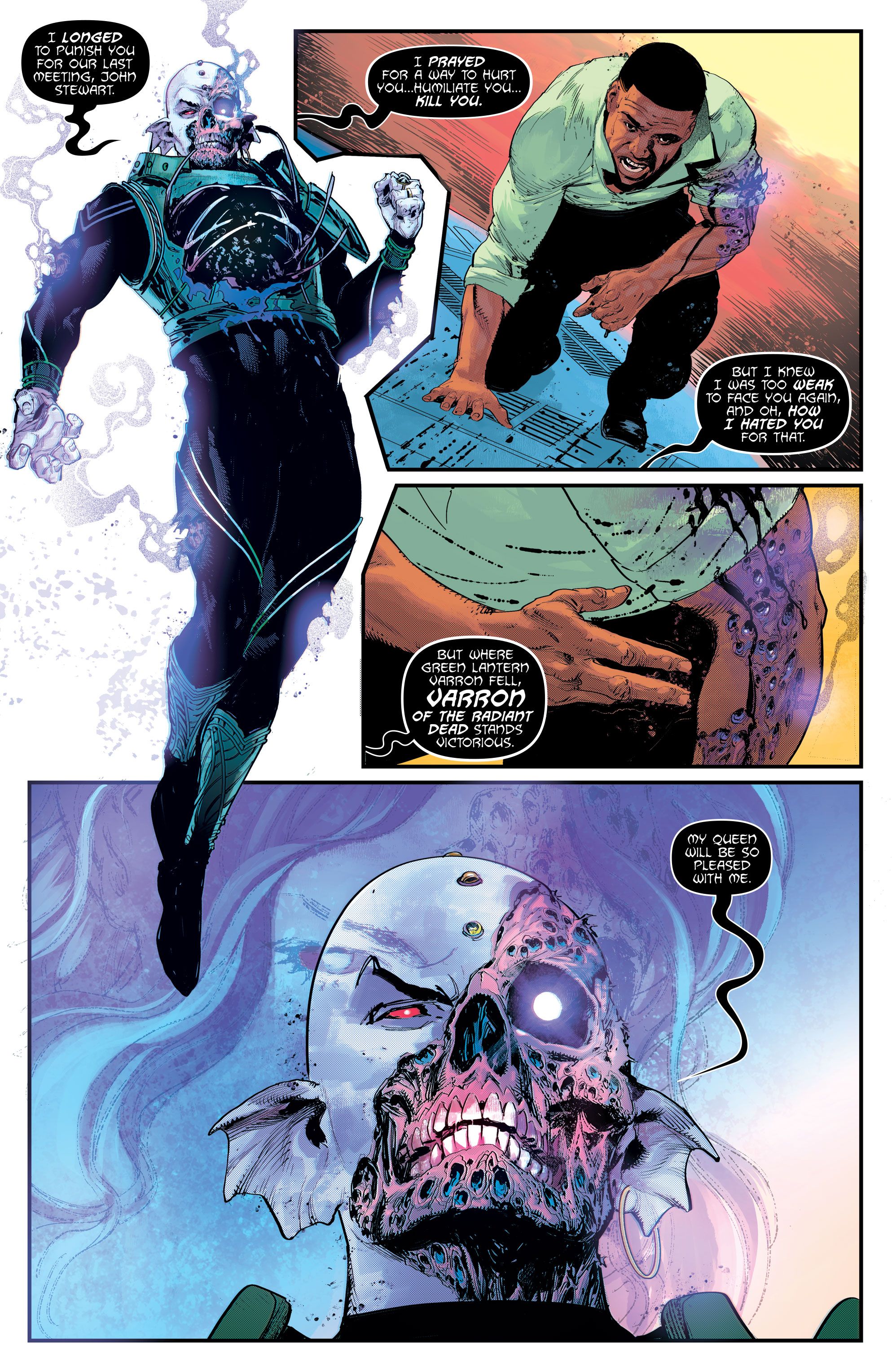 En un adelanto de Linterna Verde: Diario de Guerra #3 Por Phillip Kennedy Johnson y Montos, John está en peligro. Acaba de ser atacado por el Green Lantern Varron, anteriormente vivo, ahora un miembro completamente convertido de Radiant Dead. El soldado zombificado se burla de John y de la infección que ahora padece.