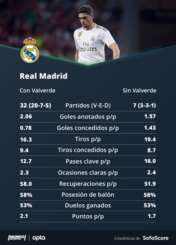 Con los números en la mano, el Real Madrid pierde capacidad de gol y, sobre todo, consistencia defensiva cuando no juega Fede Valverde. Con el joven medio, el equipo de Zidane ve reducida a la mitad el promedio de goles encajados (de 1,43 a 0,78) además de recuperar más balones (de 51,9 a 58).