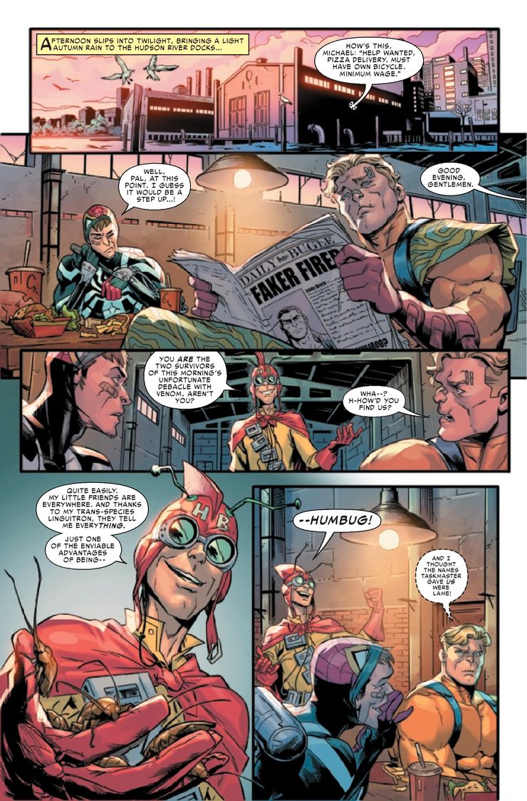 Sin embargo, David Michelinie aprovechó la oportunidad que le brindaba Veneno: protector letal, una nueva serie ambientada en el pasado de Eddie Brock, para desempolvar a este improbable equipo. La serie está escrita por Michelinie con arte de Ivan Fiorelli y Bryan Valenza. Sin embargo, a los “desagradables Vengadores” no les va mucho mejor contra Venom. Después de un torpe intento de seguir a Eddie Brock sin ser notado, el trío es emboscado por Venom. En las primeras páginas de Venom: Lethal Protector #1, Jagged Bow es asesinado por el despiadado simbionte, mientras que Death-Shield y Blood Spider corren por sus vidas. Más adelante en el número, se ve a los dos sobrevivientes lamiendo sus heridas en un almacén abandonado. Están debatiendo si aceptar un trabajo como repartidor de pizzas es en realidad una mejor opción que continuar con sus carreras disfrazadas, cuando aparece otro villano poco probable: Humbug. Al escuchar su nombre, Blood-Shield susurra: “¡Y pensé que los nombres que Taskmaster nos dio eran tontos!” Esto resume bastante bien la triste historia de este improbable equipo de villanos disfrazados.