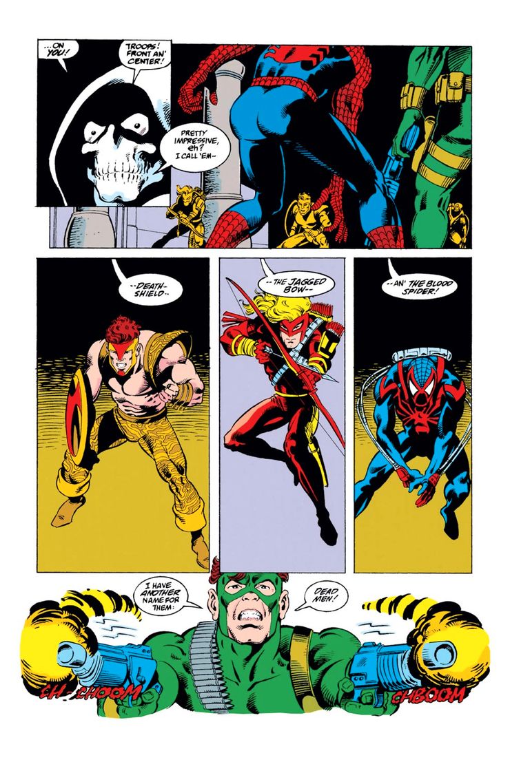 Death-Shield, Jagged Bow y Blood Spider han sido entrenados para imitar el estilo de lucha del Capitán América, Hawkeye y Spider-Man. También poseen equipos que coinciden con los de los héroes, y Blood Spider incluso tiene superpoderes de orígenes no revelados. Sin embargo, nada de eso los ayuda, y son fácilmente despachados mientras su amado instructor escapa. Según Taskmaster, se supone que son “Una versión desagradable de los Vengadores,” pero su actuación es tan abismal que claramente, los autores solo se estaban divirtiendo en este cómic.