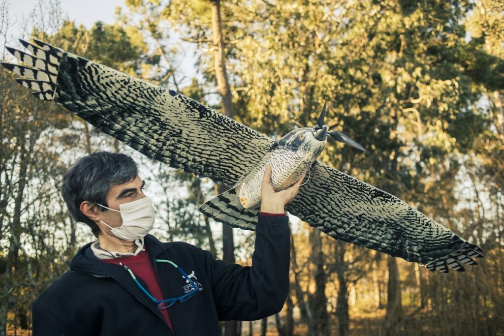 José Luis Rouco, técnico de la empresa adjudicataria de los contratos de la Guardia Civil y Vigilancia Aduanera, muestra el prototipo de un dron con aspecto de ave.