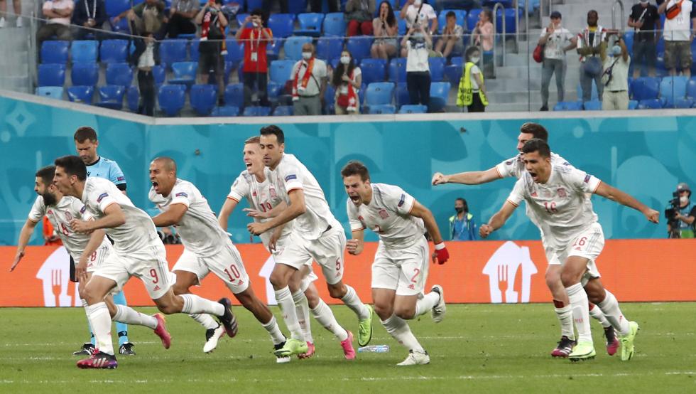 Unai Simón; Azpilicueta, Laporte, Pau Torres (Thiago, m. 113), Jordi Alba; Koke (Marcos Llorente, m. 92), Busquets, Pedri (Rodri, m. 119); Ferran Torres (Oyarzabal, m. 91), Morata (Gerard Moreno, m. 54) y Sarabia (Dani Olmo, m. 46).