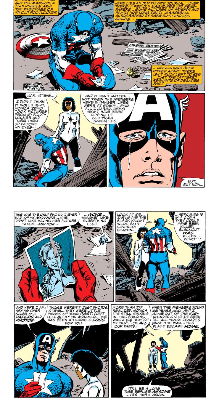 Cap descubre que los Maestros han destruido su baúl que contiene todas sus posesiones personales más sagradas, incluida una foto con Bucky tomada justo antes de que lo mataran, la única foto de Steve de su madre, una pelota de béisbol firmada por Babe Ruth y Lou Gehrig, y la original de Cap. escudo triangular. Tal crueldad gratuita muestra cuánto Zemo odia a Cap por matar a su padre, quien creó la primera versión de Masters of Evil y murió accidentalmente luchando contra Steve. En el apogeo de la batalla por la Mansión de los Vengadores, con los nuevos Maestros del Mal finalmente derrotados, Cap supera a Zemo en una batalla en la azotea y, mientras el villano se cae, intenta agarrar su mano para salvarlo, pero el Barón se niega (incluso si más tarde se reveló que sobrevivió a la caída).
