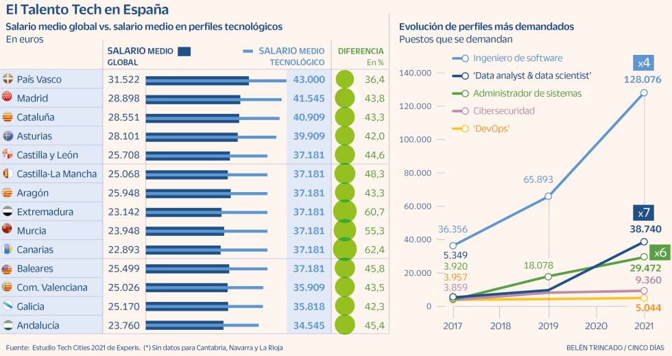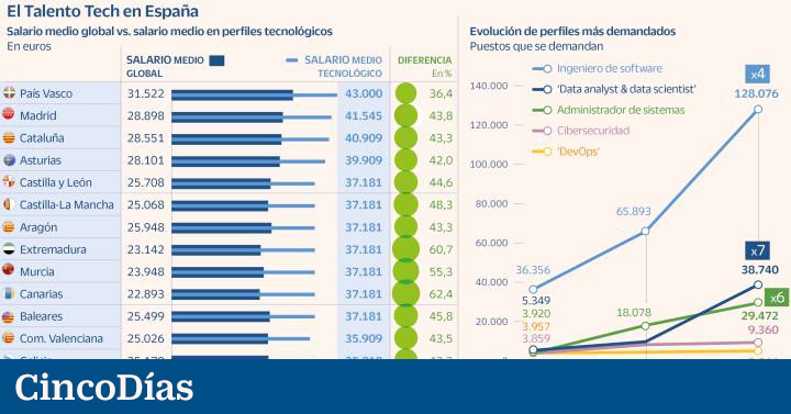 Los profesionales que ocupan puestos relacionados con la tecnología informática (IT) en España ganan un sueldo medio de 37.660euros brutos al año. La media nacional se sitúa en 26.500 euros. Esto se traduce en una diferencia de más de 11.000 euros, es decir, en un sueldo un 42% más alto en el caso de los perfiles tecnológicos, según ha indicado este martes el director de operaciones de Experis, Fernando Aguilar, en la presentación del estudio Tech Cities 2021, que su compañía ha elaborado junto a la patronal tecnológica DigitalES y el apoyo de la secretaría de Estado de Digitalización e Inteligencia Artificial.