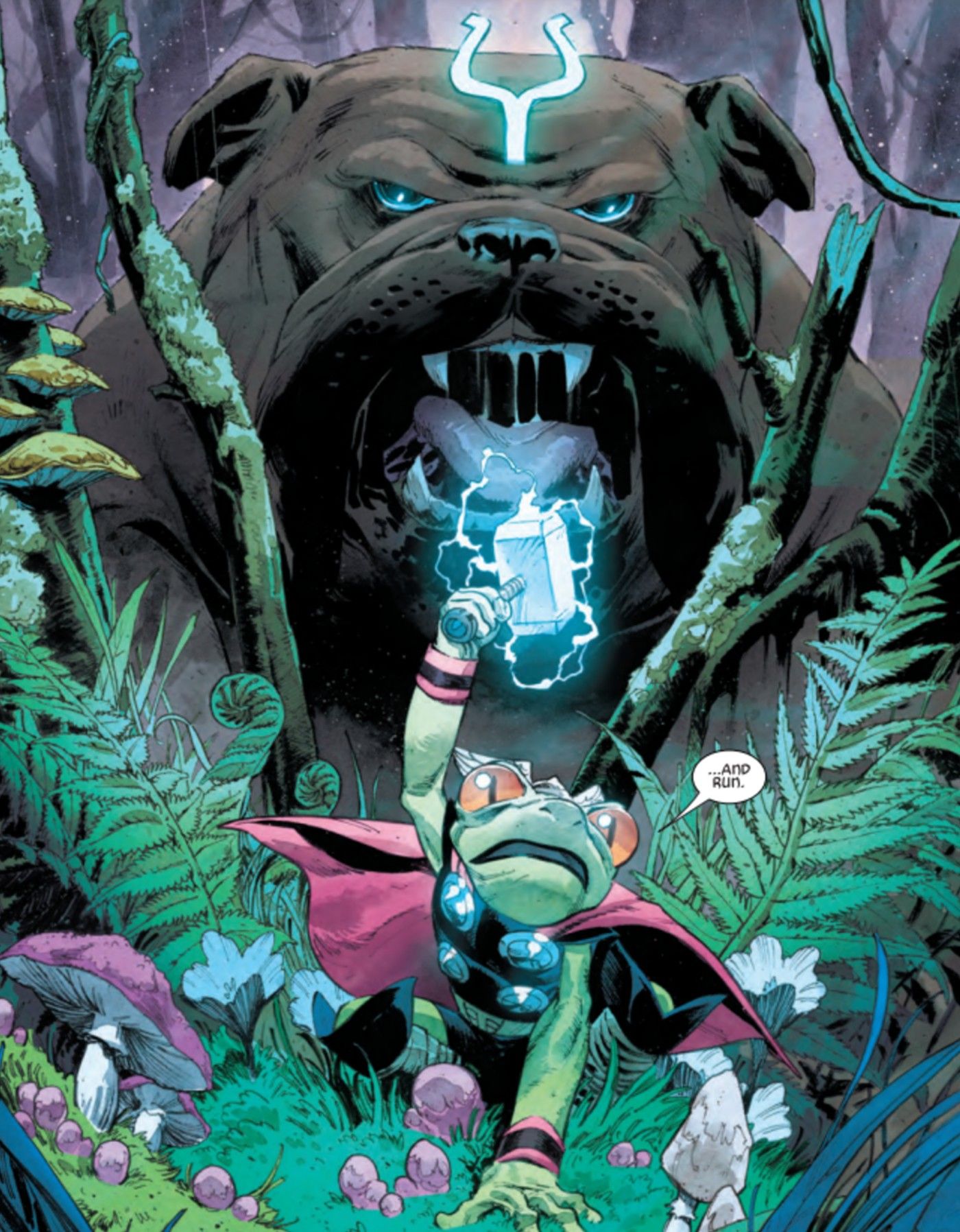 Al darse cuenta de que necesitan el poder de un dios para enfrentarse a los demonios, los perros superheroicos de Marvel deciden llamar a Throg, una rana que empuña una porción del poder de Thor.