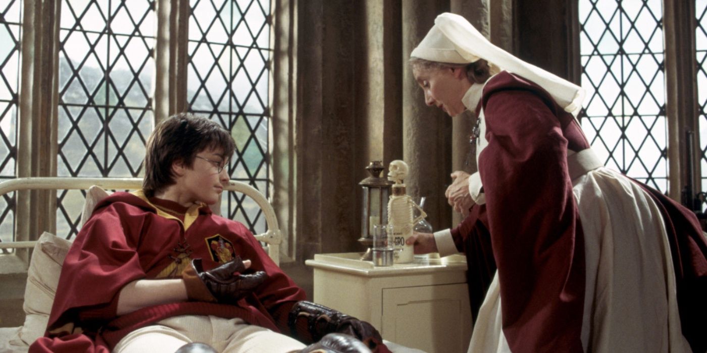 La medicina mágica se ve más de cerca en el ala del hospital de Hogwarts, dirigida por Madam Pomfrey (interpretada en las películas por Gemma Jones). A lo largo de los libros y las películas, Harry y sus amigos se encuentran en la enfermería después de varias desventuras. Uno de los incidentes más notables es una escena en la que a Harry le vuelven a crecer los huesos tortuosamente después de un accidente de Quidditch en Cámara de los Secretosaunque el trío generalmente termina siendo atendido por Madam Pomfrey en el futuro a lo largo de cada entrega.