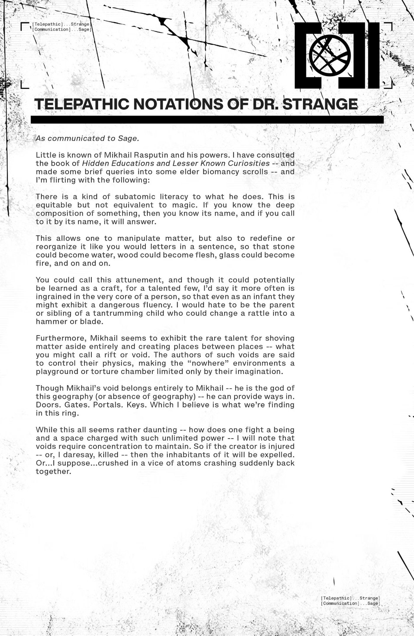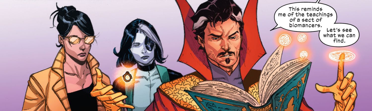 En Fuerza X #45 – por Benjamin Percy, Robert Gill y Guru-eFX – Domino y Sage se acercan al Dr. Strange para obtener más información sobre un anillo que pertenece a Mikhail.