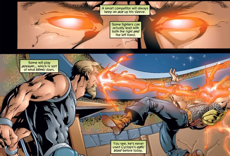 Las habilidades mutantes de Mimic le permiten copiar hasta cinco habilidades mutantes que puede usar cuando se le ordene, los poderes operan a la mitad de su capacidad en comparación con su portador original. Las explosiones ópticas de Cyclops se han considerado uno de los poderes más peligrosos de los X-Men, y Scott pasó años trabajando para controlar el poder que canaliza a través de su característico visor de cuarzo rubí. En este caso, son el arma secreta de Mimic, habiendo usado sus otros poderes mutantes contra otros oponentes que lo ayudaron no solo a sobrevivir sino también a ganar popularidad. Esta versión del Capitán América fue creada para luchar contra extraterrestres, no nazis en la Segunda Guerra Mundial y su entrenamiento ha sido en los Juegos en lugar de junto a los Vengadores. Sus poderes otorgados por Skrull y la imitación de su escudo característico no son rival para el poder de Mimic, que incluso a un nivel reducido es lo suficientemente fuerte como para romper la pared con el cuerpo de Rogers.