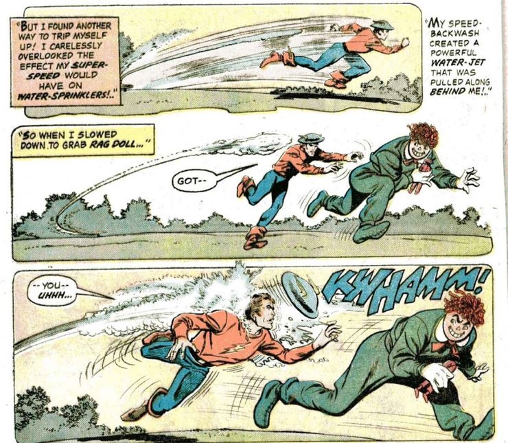 Durante la persecución de Jay Garrick del villano Rag Doll, Flash corre por un rociador de agua a velocidades supersónicas y, de hecho, tira del agua detrás de él después de que pasa corriendo. Cuando reduce la velocidad para atrapar a Rag Doll, toda el agua que se arrastra detrás de él choca contra Flash desde atrás, lo tira al suelo y permite que Rag Doll escape. Los poderes de Garrick lo dejan prácticamente ileso después de que el agua que se arrastra detrás de él choca contra él, pero si una persona normal estuviera de pie junto a Jay cuando se detuvo, la fuerza del agua moviéndose a la velocidad de Flash los destrozaría. Si bien es el Pensador quien obliga a Flash a cometer este error, el error en sí es uno que cualquier Flash podría cometer en cualquier momento.